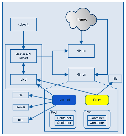kubelet是Master API Server和Minion/Node之间的桥梁,接收Master API Server分配给它的commands和work,通过kube-apiserver间接与Etcd集群交互,读取配置信息。