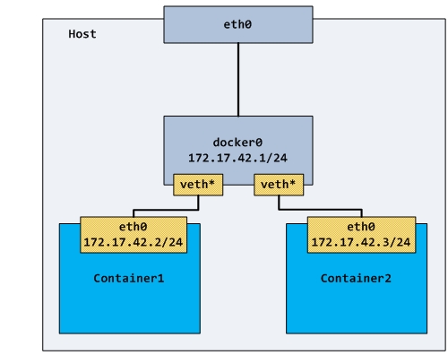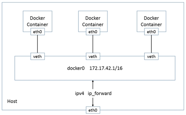 由Docker创建处理的每个容器,都会创建一个虚拟以太设备对(veth pair),一端关联到网桥,另一端使用Namespace技术映射到容器内的eth0设备,然后从网桥的地址段内给eth0接口分配一个IP地址。