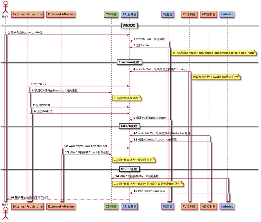 AD 控制器发现 Pod 和 PVC 处于待挂接状态,于是调用 Volume Plugin 挂接存储设备到目标 Worker 节点上