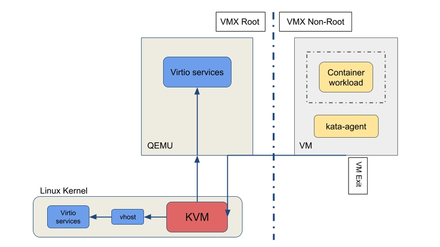 在虚拟机内kata-agent作为一个daemon进程运行,并拉起容器的进程。kata-agent使用VIRTIO或VSOCK接口(QEMU在主机上暴露的socket文件)在guest虚拟机中运行gRPC服务器。kata-runtime通过grpc协议与kata-agent通信,向kata-agent发送管理容器的命令。该协议还用于容器和管理引擎(例如Docker Engine)之间传送I / O流(stdout,stderr,stdin)。